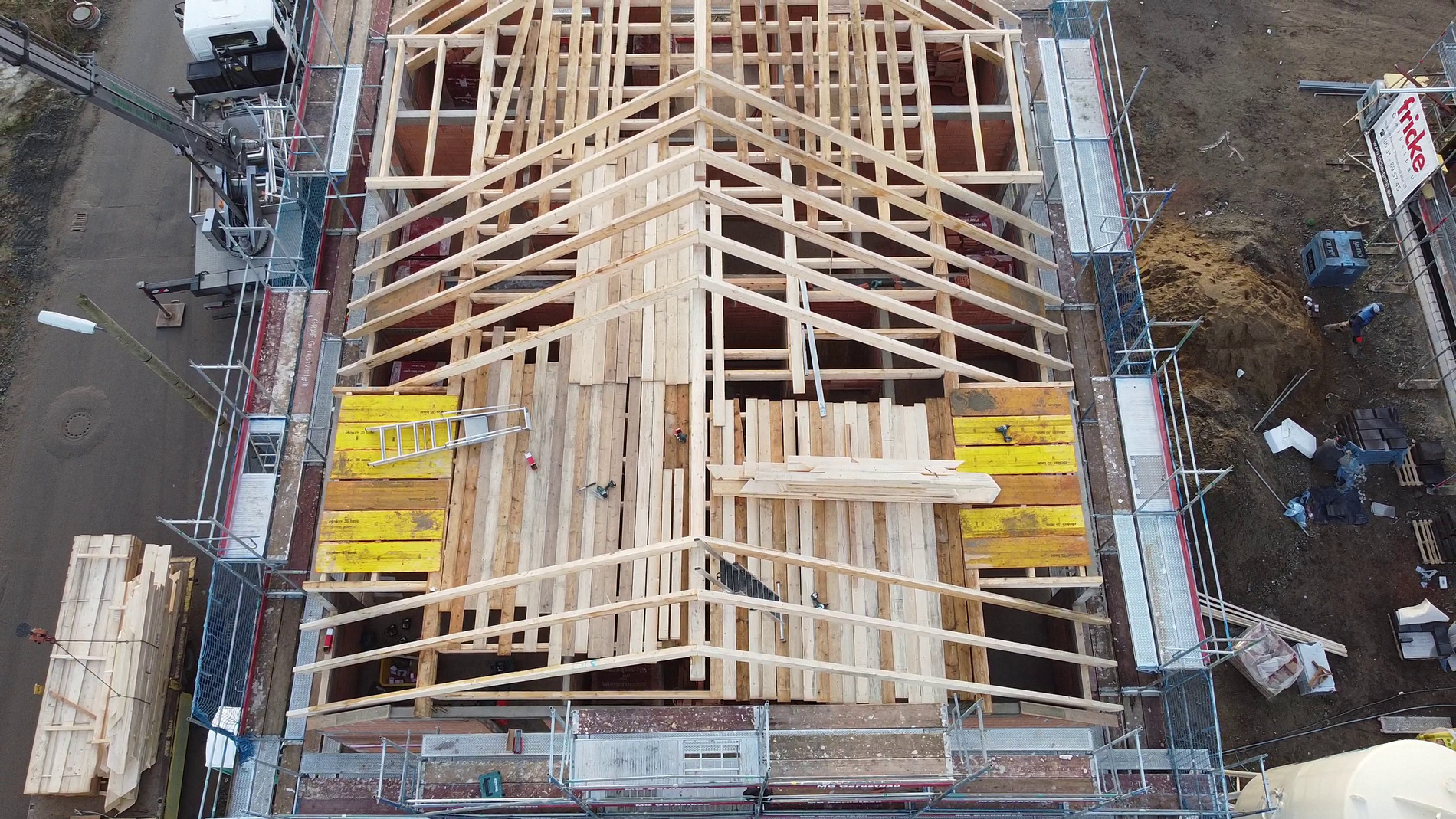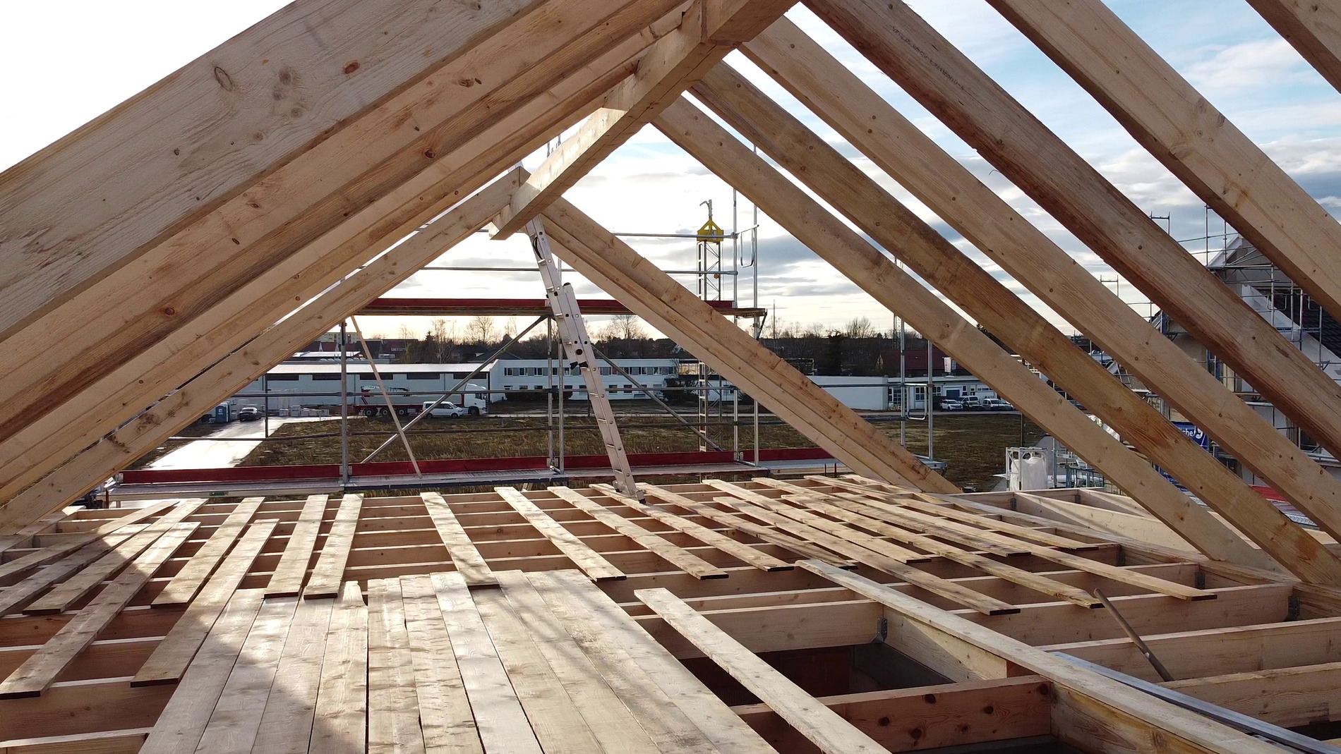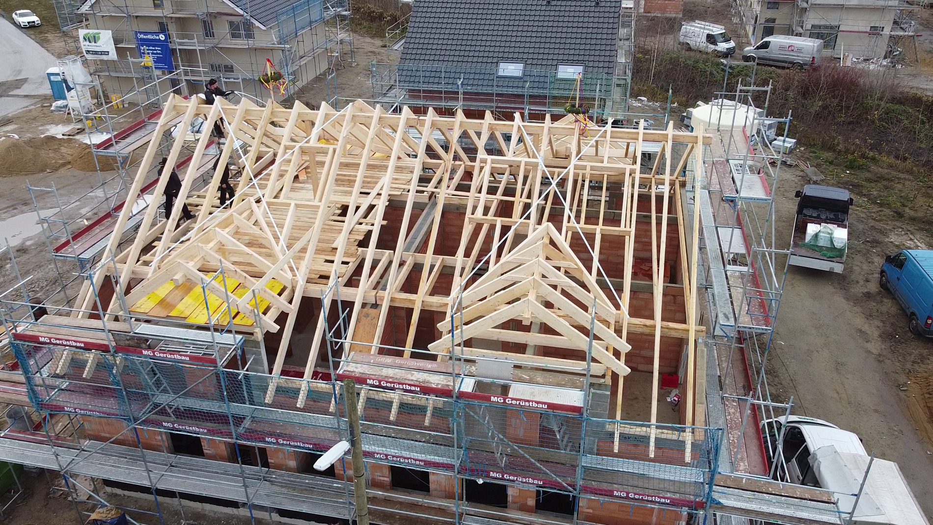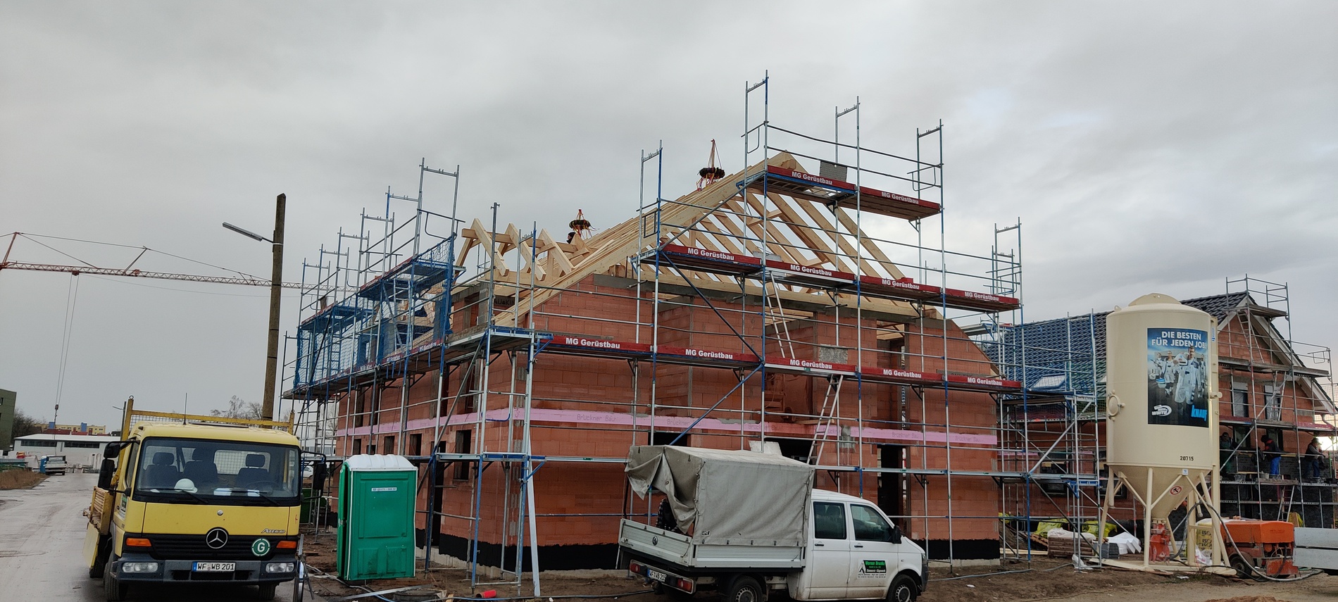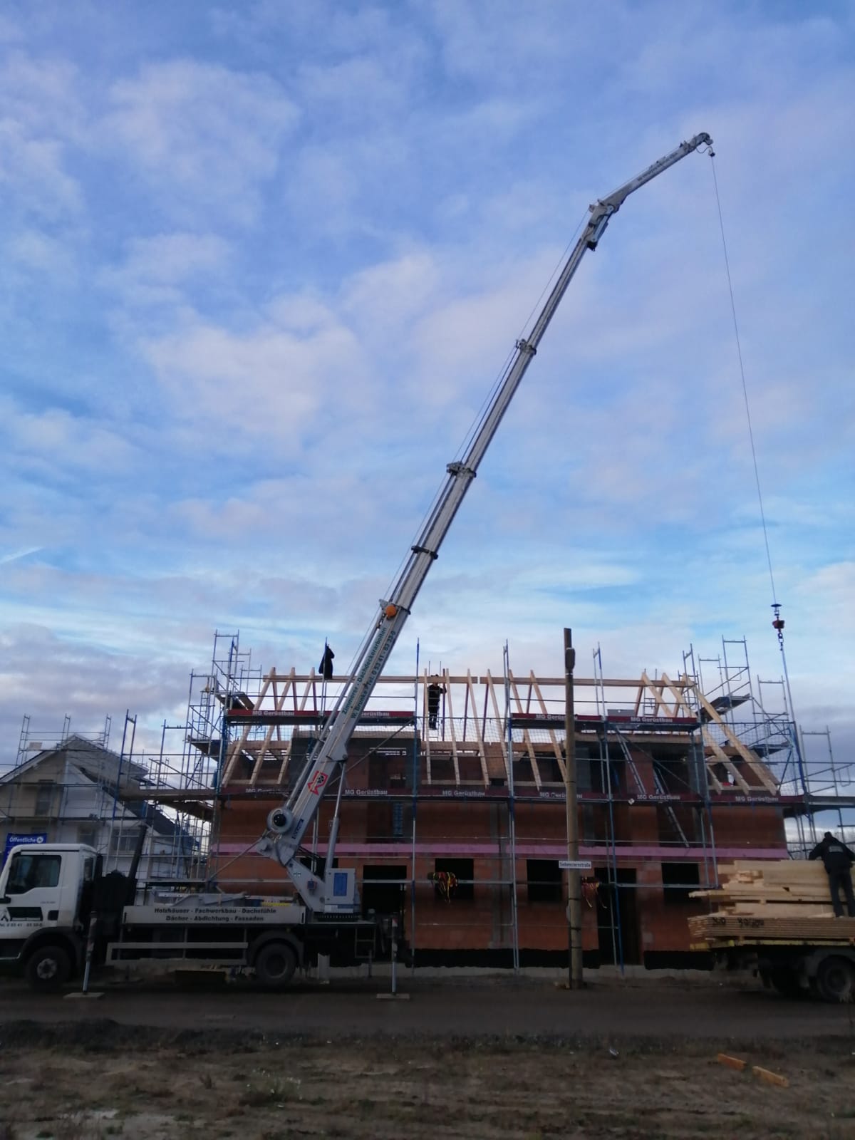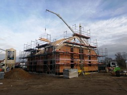 Am Montag (14.12.2020) wurde dann der Dachstuhl errichtet! Corona-bedingt gab es kein richtiges Richtfest mit Gästen, sondern eine kleine Richtzeremonie mit beiden Bauherrenfamilien sowie ein paar Zimmerleuten.