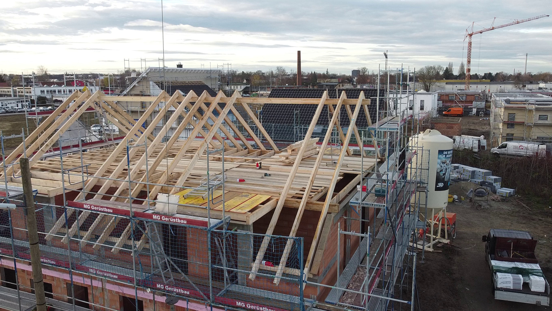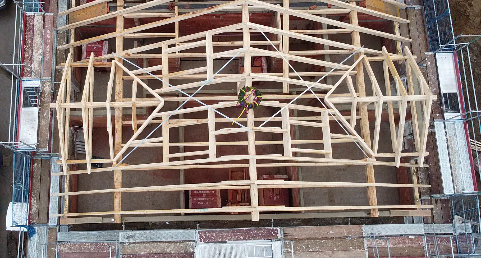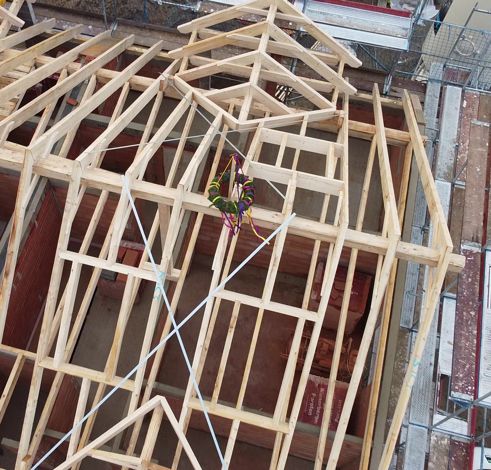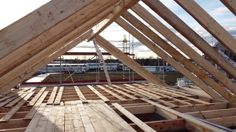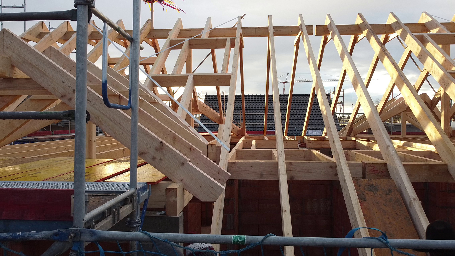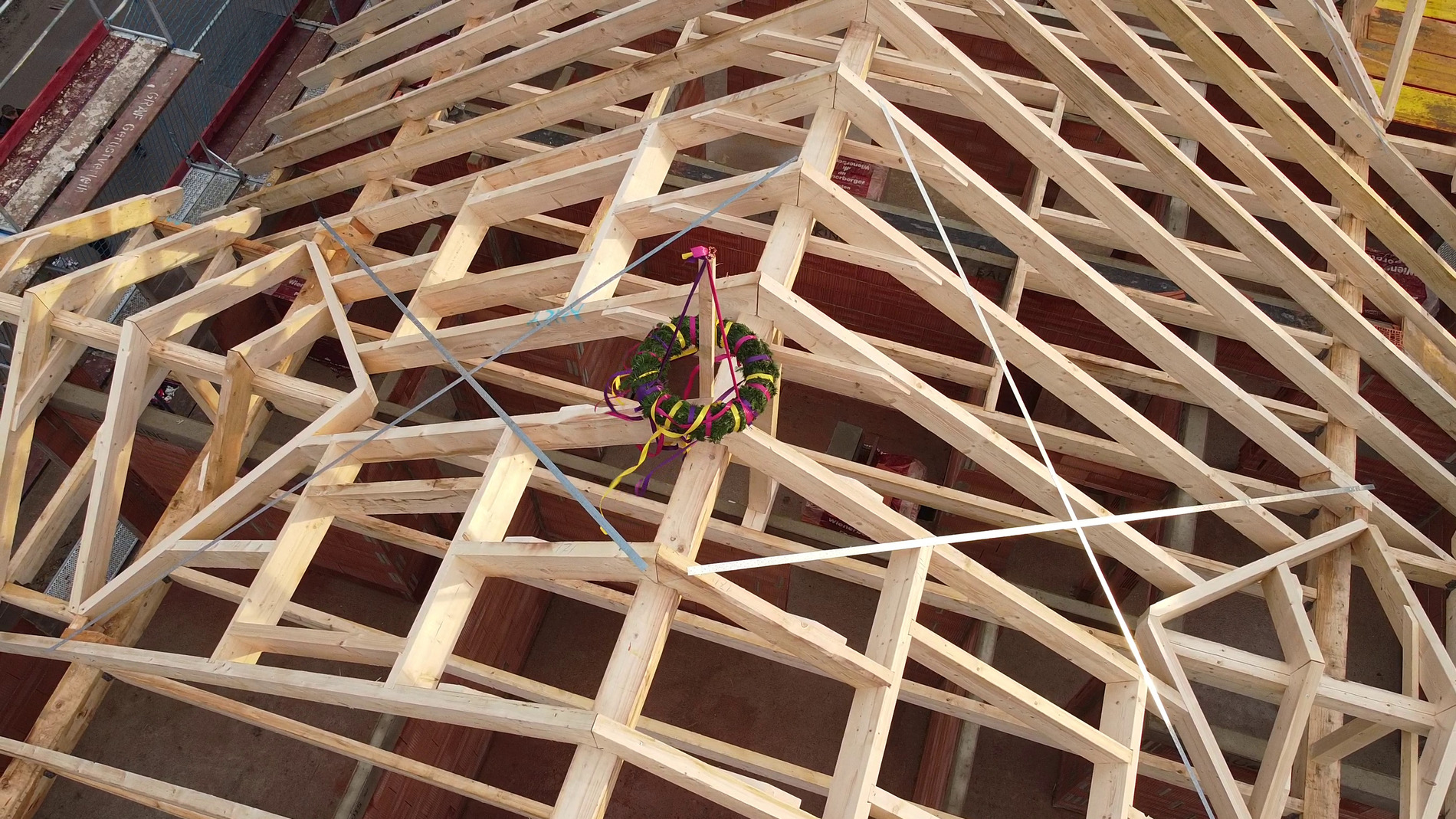 Am Montag (14.12.2020) wurde dann der Dachstuhl errichtet! Corona-bedingt gab es kein richtiges Richtfest mit Gästen, sondern eine kleine Richtzeremonie mit beiden Bauherrenfamilien sowie ein paar Zimmerleuten.