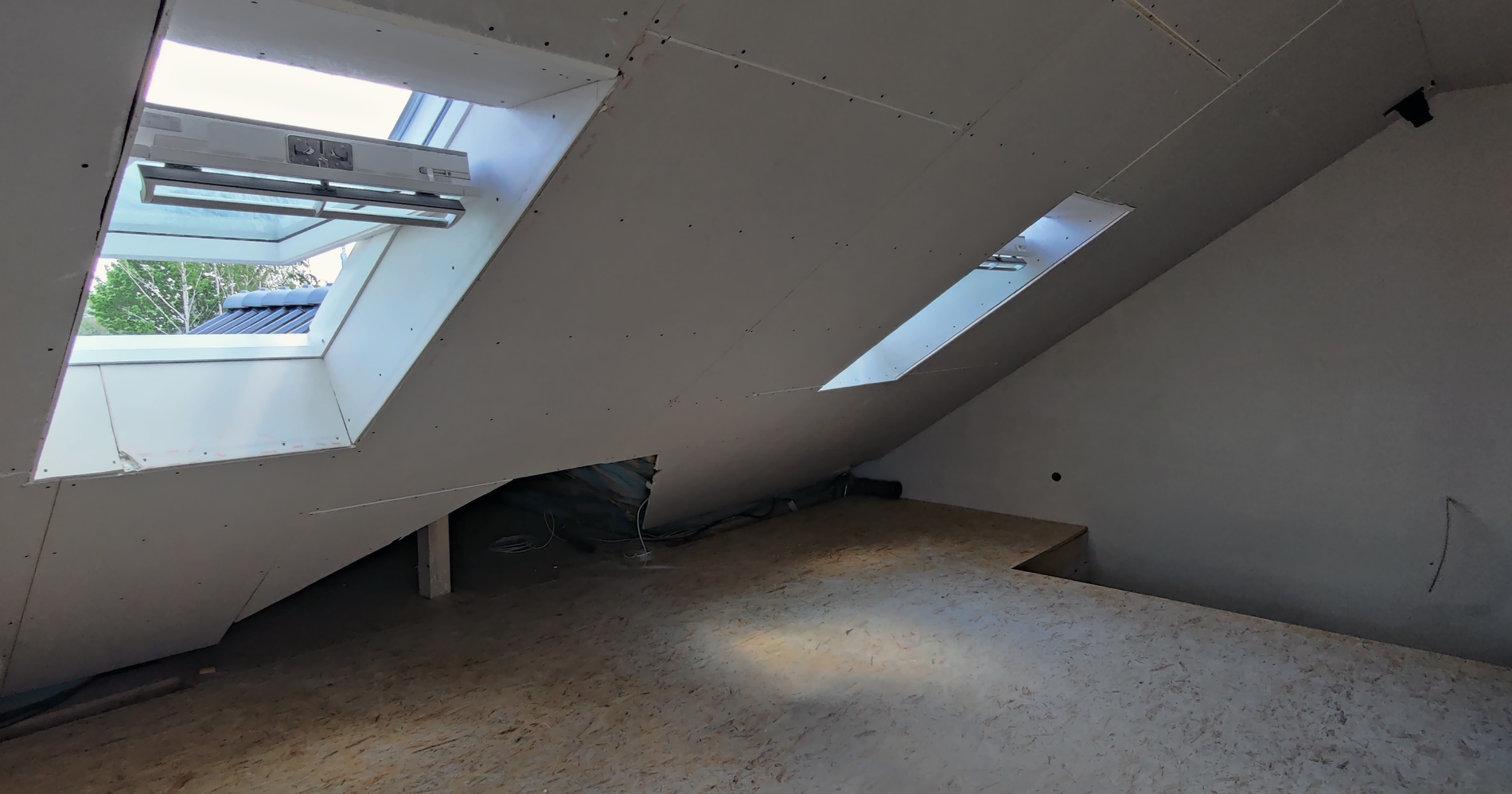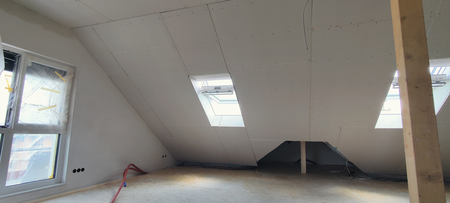 Die ersten Hausgäste sind Anfang KW 23 schon ausgezogen, nachdem sie Haus die ersten Flugversuche unternommen haben. Danach wurden die Dachschrägen im OG und Studio verkleidet.
