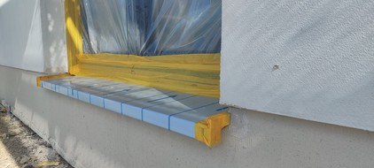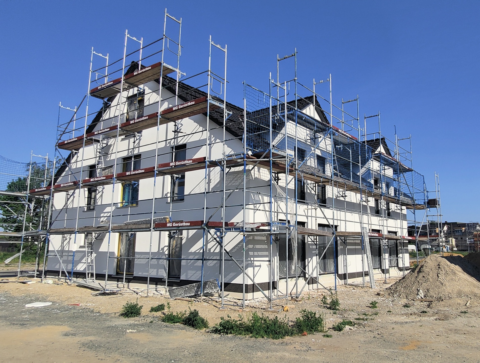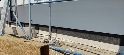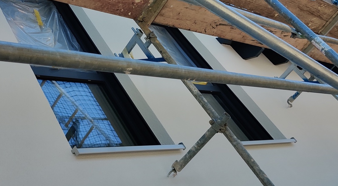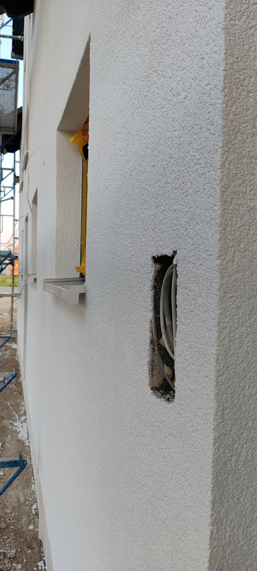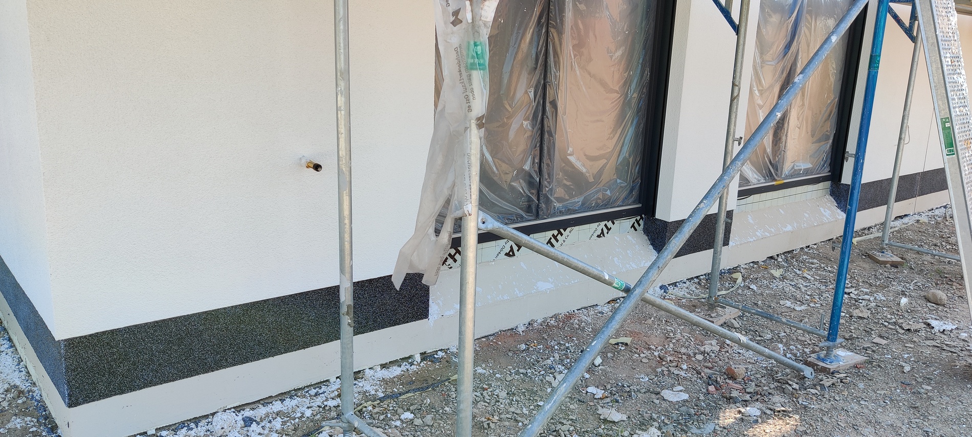 An der Aussenseite hat sich auch einiges getan: die Aussenfensterbänke wurden montiert und das Haus wurde verputzt und erstrahlt nun in weiß mit abgesetztem dunklen Sockel (Buntsteinputz). Anfang KW 25 sollen die Farbakzente folgen und dann wird auch bereits das Gerüst abgebaut werden.