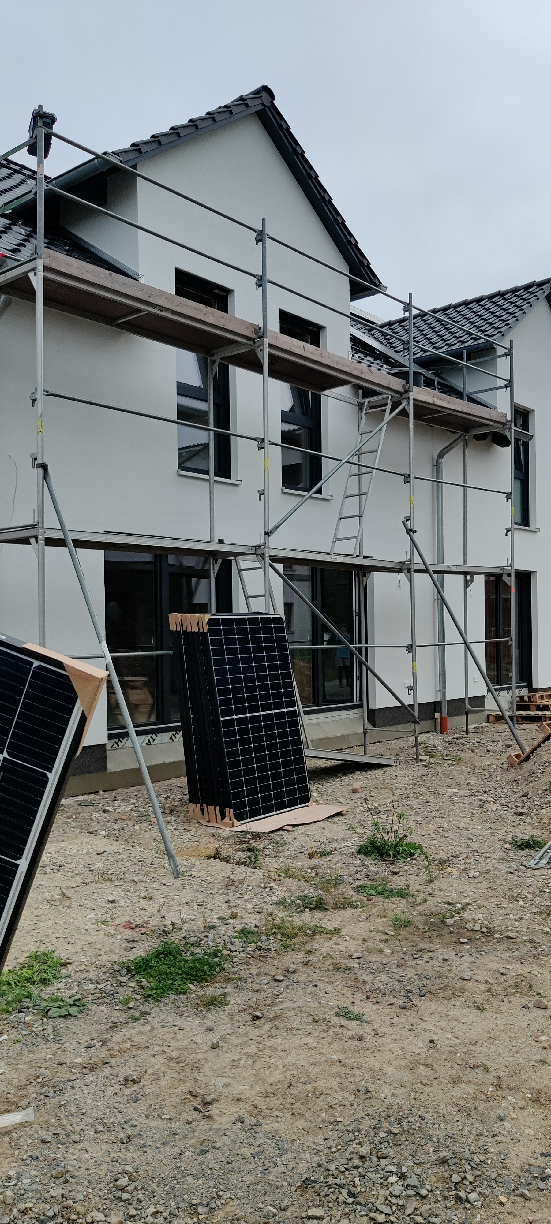 Leider verzögerte sich nach Installation der Dachunterkonstruktion (siehe Artikel vom 17.05.2021) der Liefertermin für die Dachmodule und das Hauskraftwerk weiter, so dass das Gerüst des Bauträgers nicht mehr verwendet werden konnte. Die PV-Firma musste also erneut einrüsten. Zum Glück war es nicht notwendig das ganze Haus erneut einzurüsten.