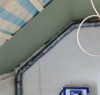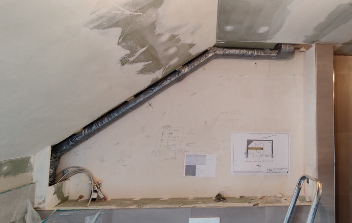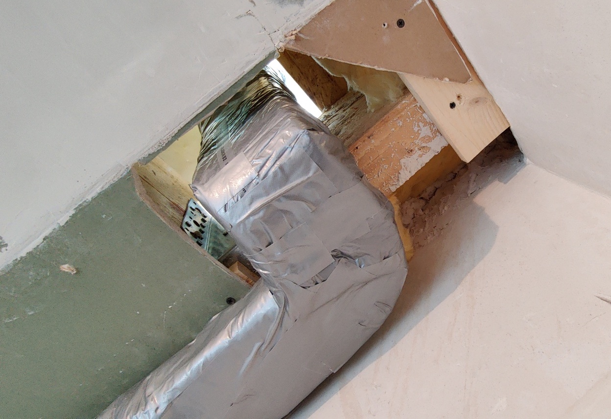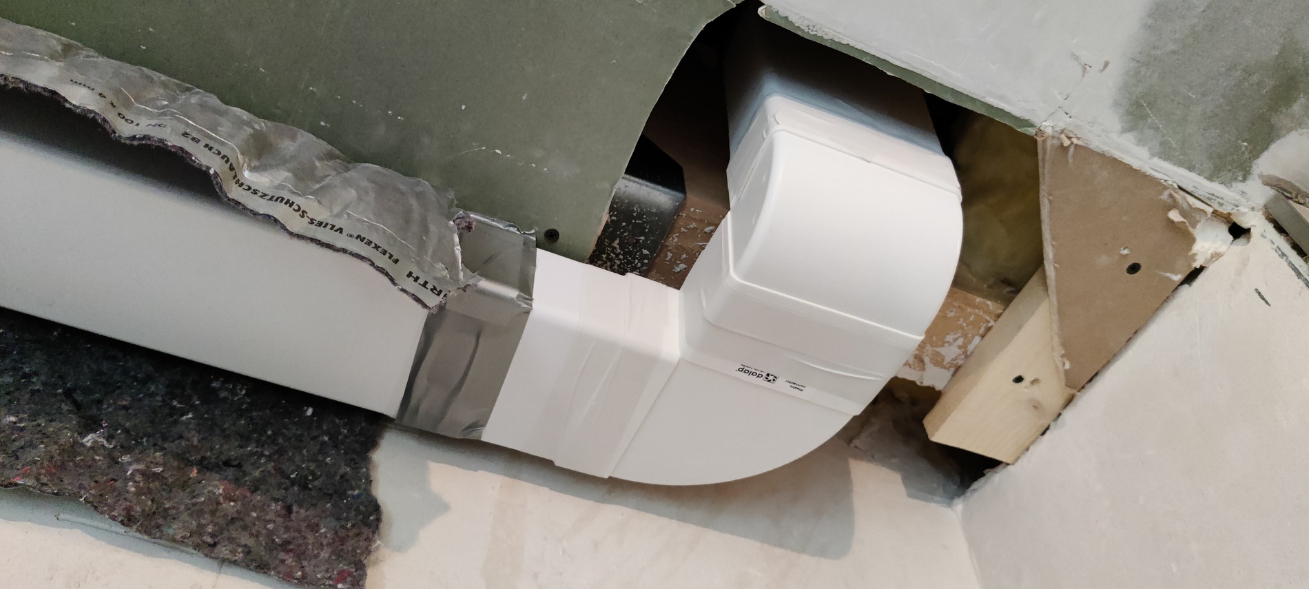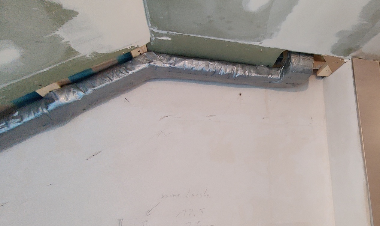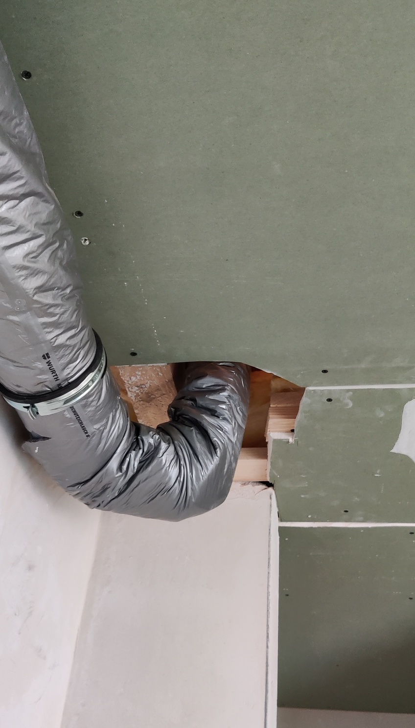 Unsere Lösung: direkt nach der Hausübergabe haben wir die Trockenbaukonstruktion runtergerissen und dann im Nachgang die dicken Rohrelemente durch Flachkanalelemente ersetzt – und diese dabei möglichst raumsparend montiert, so dass wir in dem zukünftigen Einbauschrank (Umsetzung durch Tischler) möglichst wenig Stauraum verlieren.