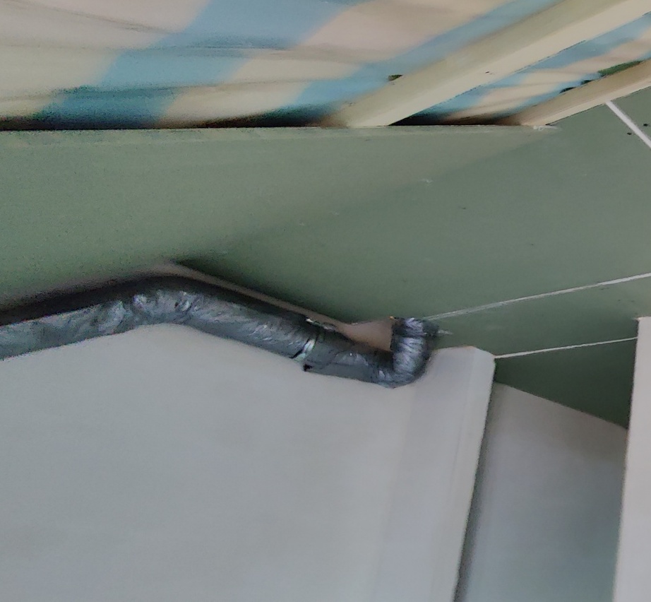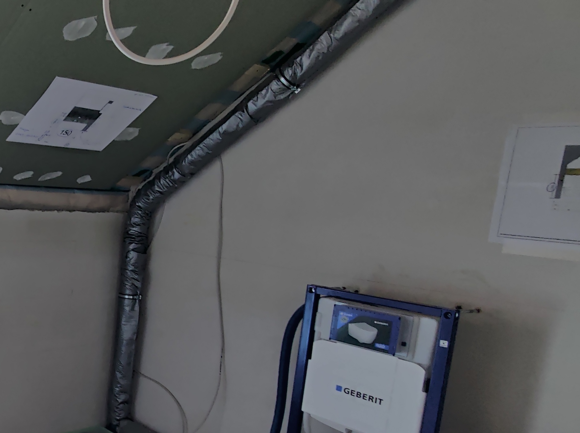 Leider sind wir weder in der Zeichnungsdurchsprache mit der Planerin im Januar 2020 noch während der Rohbaudurchsprache mit dem Sanitärgewerk im Januar 2021 darauf hingewiesen worden, dass vom OG Bad aus ein Belüftungsrohr an der Wand entlang hoch ins Dach verlegt wird – dabei hatten wir bei letzterer unsere fertige Badplanung dabei und hatten auch darauf hingewiesen, dass dort ein Einbauschrank realisiert werden wird.