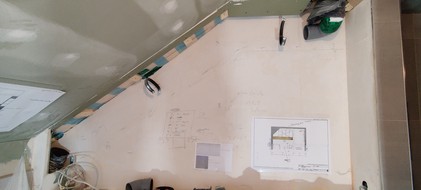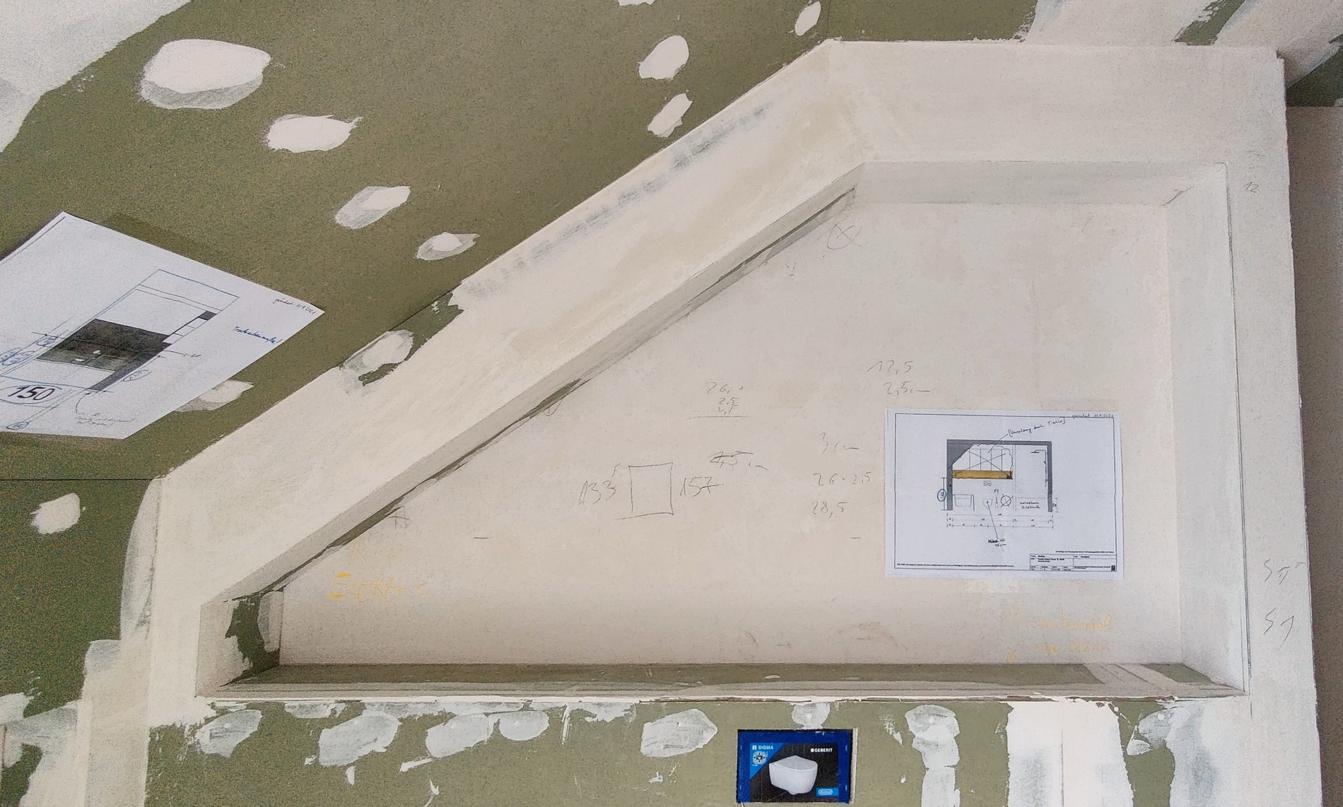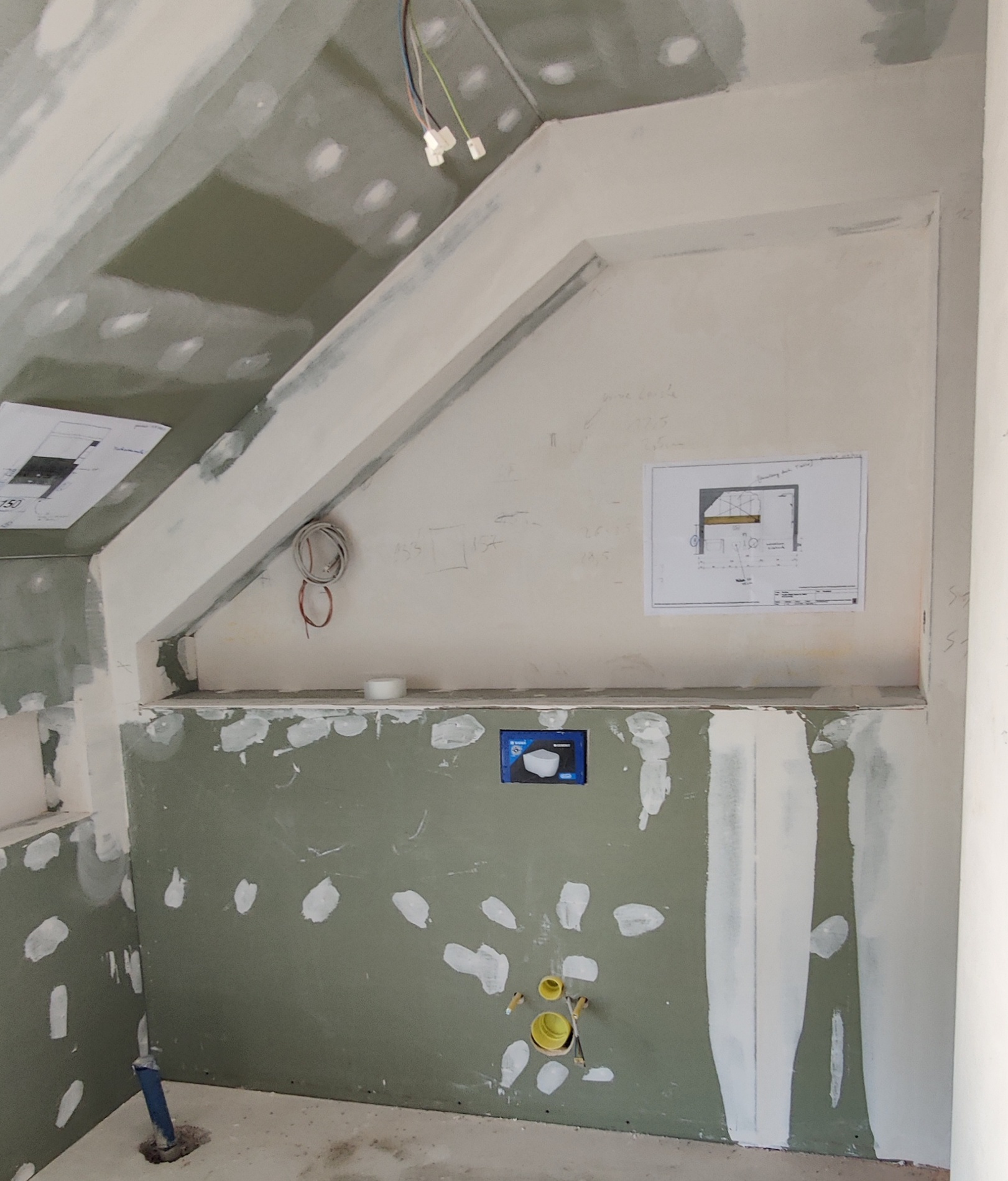 Leider hat sich das Sanitärgewerk nicht wirklich Mühe gegeben, das Belüftungsrohr möglichst raumsparend zu montieren und zu guter letzt hat der Subunternehmer des Trockenbauers auch noch eine extra große Konstruktion darum gebaut. Soviel zum Versuch alles frühzeitig abzustimmen – auch hingen überall Pläne, aber warum sollte man da auch drauf schauen…